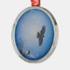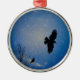 A crow bravely fly through a blue, snow filled winter sky as a perched crow looks on. This is a nice winter or Christmas ornament for a nature lover.