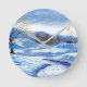 Painting of a iced over road in winter with snow all around and a red barn in the distance.