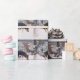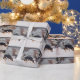 This original snow scene image on this cute dog christmas wrapping paper is from a painting of a little black and tan mixed breed dog, he’s sniffing and scratching at the thick layer of freshly fallen snow that he’s just discovered for the first time in the garden. This little dog is named Eddie, he’s a german shepherd cross breed dog and he’s enjoy the cold weather in his winter garden. In the background of this festive picture you can see a little grey garden gnome quietly sitting and reading his book at the side of the small snow covered frozen pond. There’s also lots of snow covered garden shrubs and an old wooden shed in Eddie’s garden, all these add interest to this lovely little winter snow scene on this quality christmas gift wrapping paper .