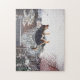 This original snow scene image on this cute dog jigsaw puzzle is from a painting of a little black and tan mixed breed dog, he’s sniffing and scratching at the thick layer of freshly fallen snow that he’s just discovered for the first time in the garden. This little dog is named Eddie, he’s a german shepherd cross breed dog and he’s enjoy the cold weather in his winter garden. In the background of this scenic snow picture you can see a little grey garden gnome quietly sitting and reading his book at the side of the small snow covered frozen pond. There’s also lots of snow covered garden shrubs and an old wooden shed in Eddie’s garden, all these bits and bobs add interest to this lovely little winter snow scene on this quality art jigsaw puzzle. The original painting of now is tilted "First Snow" and is an acrylic painting.
