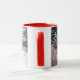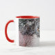This original Christmas image is a painting of a very cute little black and tan mixed breed dog, he’s sniffing and scratching at the thick layer of freshly fallen snow that he’s just discovered for the first time in the garden. This little dog is named Eddie, he’s a german shepherd cross breed dog and he’s enjoy the cold weather in his winter garden. In the background of this festive picture you can see a little grey garden gnome quietly sitting and reading his book at the side of the small snow covered frozen pond. There’s also lots of  snow covered  garden shrubs and an old wooden shed in Eddie’s garden,  all these add interest to this lovely little festive Christmas scene red ringer mug.