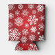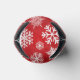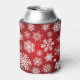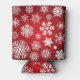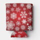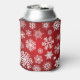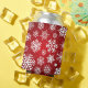 A can cooler with a red background and white snowflakes and stars. The snowflakes are of different sizes and shapes, and they are scattered all over the can cooler. The stars are also white, and they are smaller than the snowflakes. The can cooler is made of a soft, flexible material.
