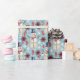 Cute snowmen with scarves and top hats are surrounded by falling snowflakes and Christmas berries on this festive wrapping paper.