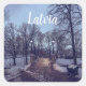 Panoramic view of early evening light of the snowy park during snowstorm with street lights, canal and decorative bridge.