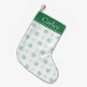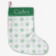 Winter green stars and light blue snowflake pattern on personalized Christmas stocking.