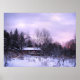 This poster features a winter sunset scene. A red house is tucked away in the trees with lights shining within. Pure white snow has piled up in the field. The clouds in the sky glow with rainbow colours of orange, pink, yellow, blue and purple.