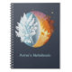 Depiction of a stylized globe in which two seasons meet—winter and autumn. On the left side, a delicate, frosty plant spreads out, symbolizing cold and tranquility. On the right side, autumnal leaves glow in warm shades of red and gold, embodying transition, passing, and change. The gentle division between the two halves is reminiscent of yin and yang, the balance between cold and warmth, endings and new beginnings.