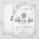 Celebrate your little ones special day with this adorable winter teddy bear birthday invitation. Featuring a cute bear in a blue hooded outfit, balloons, snowflakes, and floral accents, this design perfectly captures a cozy winter wonderland theme. Ideal for first birthdays, it combines charm and elegance with easy-to-read party details. Guests will love the festive design and parents will appreciate the stylish, memorable keepsake.
