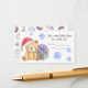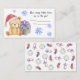 Watercolor cute teddy bear with christmas gift, in santa hat. On the reverse side of the card are holiday christmas pattern (candy cane, christmas tree ball toy, christmas socks).