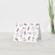 Watercolor cute teddy bear with christmas gift, in santa hat. On the reverse side of the card are holiday christmas pattern (candy cane, christmas tree ball toy, christmas socks).