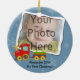 Fun and cute personalized photo Christmas ornamnent. Winter Toy Train Design for Baby or Kids. Could be a great Baby's First Christmas Ornament. Add your own digital photo and headline. Features white, snowy frame with light blue and white snowflakes background along with an adorable colourful toy train in red, yellow, orange and green! A perfect memento keepsake for any special holiday year.