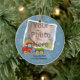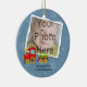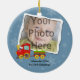 Fun and cute personalized photo Christmas ornamnent. Winter Toy Train Design for Baby or Kids. Could be a great Baby's First Christmas Ornament. Add your own digital photo and headline. Features white, snowy frame with light blue and white snowflakes background along with an adorable colourful toy choo-choo train in red, yellow, orange and green! A perfect memento keepsake for any special holiday year.