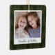 A beautiful double sided Christmas photo ornament displaying a favourite photo on each side, on a dark hunter green watercolor background dotted with pine trees. Personalize with a custom caption on the front in handwritten lettering, and add the year to the back.