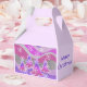 A modern, stylised winter landscape with frosted pine trees and sparkling snowflakes. Favour box with a purple, pink, silver grey and white customizable design for you to personalise with your own text, images and ideas. Image created using a digitally enhanced coloured pencil drawing.