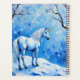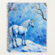 A dreamlike scene captures a unicorn in a moment of quiet contemplation amidst a gentle snowfall. The primary colours are cool blues, icy whites, and whispers of silver. The unicorn, with its flowing mane and tail, is depicted with slightly stronger pigment to stand out, while the falling snow is created with tiny, delicate white spatter marks and lighter washes. The ground is a blend of snowy white and faint blue shadows, with bare tree branches appearing as soft, blurred lines in the background, adding to the tranquil and ethereal mood. The overall effect is delicate and almost crystalline, perfect for a calming interior space.