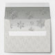 Lovely Winter wedding invitation envelope, done in a winter white swirl background, with a pretty silvery snowflake, on the front and a silver edge to the back flap. The inside of the envelope is done in silver tone gradient, with silvery white snowflakes. Dark grey text return address, on the back flap, is fully customizable and ready to personalize with your information. Lovely finishing touch to our Winter White and Silver Snowflake wedding invitations.