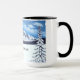 A mug with a beautiful winter scene including snowy mountains, rustic cabin and snow covered evergreens. Original artwork by W.B.