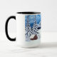 Une tasse avec une belle scène hivernale incluant des montagnes enneigées, des cabines rustiques et des greens enneigés. Oeuvre originale de W.B.