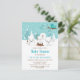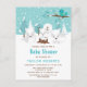 This cute and fun baby shower invitation features an adorable arctic fox family in a winter wonderland setting with snow capped trees and a blue bird on a branch with holly. In the background is a teal blue green sky and falling snowflakes. The text combines decorative and sans serif fonts for a stylish and modern look. This is perfect for a Christmas or winter themed baby shower.