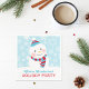 Winter wonderland holiday party napkin design features a happy winter snowman wearing a hat and scarf and custom text. The background has a pattern of snowflakes. Ice blue, turquoise, red, and white colours with black and grey accents.