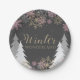 winter wonderland winter birthday party plates with grey background, pink and gold snowflakes