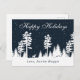 Winter forest wonderland silhouette Christmas holiday postcard in white with a blue background.