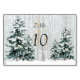 Pretty Winter wedding table number card with White Birch Tree forest, pine trees, sparkle and snowflakes.
