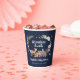 Rustic winter baby shower paper cups with watercolor illustrations of cute woodland animals (bear, fox, deer and owl), florals, greenery and gold stars and snowflakes. "Adventure Awaits" and the mother-to-be's name are written in a white script against a dark blue background.