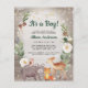 Budget-friendly rustic winter baby sprinkle invitation with cute watercolors of woodland animals, florals, greenery and an overlay of gold stars and snowflakes. "It's a Boy!" or "It's a Girl!" and the mother-to-be's name are written in a hunter green script.