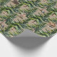 A beautiful watercolor-painted woodland forest wrapping paper featuring a repeat pattern of luscious fir and spruce trees forming a forest with winter forest animals roaming through under the season's first snowfall on a Kraft brown colour background.