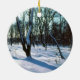 This round ornament features an image of a beautiful snowy winter woods. The image continues on the back side, resulting in the impression of seeing the full image when the ornament turns.
