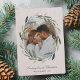 Send holiday greetings to friends and family in chic style with our elegant photo cards. Your favourite vertical or portrait oriented image is framed by an oval laurel wreath of green watercolor eucalyptus leaves on a pale wood background. Personalize with your custom holiday greeting and names beneath in charcoal grey lettering.