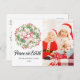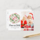 Your family photo is on the right. A modern white poinsettia flower, greenery and red berry wreath is to the left. Holiday greeting is below. Your name and the year follow.