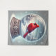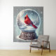 A vibrant red cardinal perched inside an ornate snow globe, surrounded by a frosty winter landscape with snowy trees and delicate snowflakes.