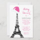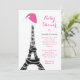 A bright pink Santa Hat and sparkling twinkle lights decorate the Eiffel Tower on this wintery, Parisian inspired baby shower invitation, making it perfect for the girly French, Paris, Parisian, winter, Christmas, romantic or Marie Antoinette themed baby shower.