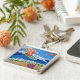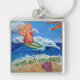 The painting shows a glimmering orange surfing angel on a blue ocean with a sparkling sun. Sea foam washes up on the sand surrounding the words "Wipe Out Cancer". There is a pink sea shell on the beach. The painting was rendered in acrylic and sprinkled with glitter for texture and shine. Personalize this keychain with your own images and messages using the "Customize It" button.