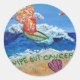 The painting was made for a group fundraising for the American Cancer Society's "Relay for Life". The booth theme was luau of "Wipe Out Cancer". The painting shows a glimmering orange surfing angel on a blue ocean with a sparkling sun. Sea foam washes up on the sand surrounding the words "Wipe Out Cancer". There is a pink sea shell on the beach. The painting was rendered in acrylic and sprinkled with glitter for texture and shine. The image was converted into cards that the team could use for the luminarias.