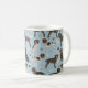 Cute wirehaired Pointing Griffon dogs sit and stand with paw prints and dog bones pattern on a coloured background.