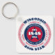 The Wisconsin State Keychain has a circular typography design with red, white, and blue colours on a white background. The text includes the state's name, capital, state abbreviation, resident's name, region, time zone, geographic coordinates, the year of its statehood, and the country - The United States of America. Unique patriotic gift idea.