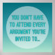 Perfect for teachers and offices is this teal and turquoise blue typography design with wise words to live by that encourage peace between classmates or coworkers. It says: You don't have to attend every argument you're invited to...in all caps bubble type font inside of a round circle frame where the colors fade from the top in a dark to light ombre gradient. The text is outlined in gray. This is a classy addition to any wall at home or in the workplace, classrooms, waiting rooms, hotel lobby, break room or what is your idea? A simple clean minimalist style that goes well anywhere. #peacemakers #poster #teal #blue #typography
