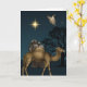 Wisemen and their camel are looking towards an angel and the star of Bethlehem in a dark blue night sky on their way to see the Christ child. In the background shadows is a big oak tree.