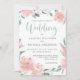 Framed in a wispy soft floral border of pastel pink peonies and mixed flowers with trailing teal-blue greenery, this lovely feminine wedding invitation is accented with contemporary script text spelling out the word "wedding" in modern style. An elegant text layout is used in this design that you can easily personalize with your wedding details. The colour scheme works beautifully for weddings in any season of the year.