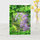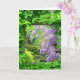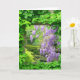 Photo of ivy- covered stone wall with window through which is seen" dripping" lavender-coloured wisteria. Card is blank inside.