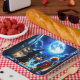 Scary Halloween Plateswith ai art depicting a little boy and girl in a clown and witch costume walking out the house to encountered a scary monster at the end of their sidewalk.