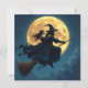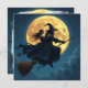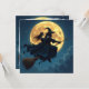 A super cool witch and warlock on a broom in front of a full moon Halloween Personalized card.