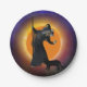 A witch and her familiar, a black cat, are silhouetted against a bright orange harvest moon in a dark blue-grey sky.  Beautiful Halloween image for your party!
