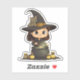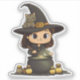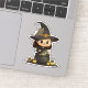A cute kitty sits on the hat of a young witch as she brews a potion in her cauldron. This kid-friendly sticker is great for celebrating Halloween.