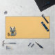 Angry looking cat with tattoo markings, bone necklace, and a skull on top of its head is sitting beside a voodoo doll with pins.