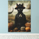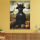 This whimsical Halloween artwork features a stylish black cat dressed as a Victorian witch, surrounded by a quirky array of jack-o'-lanterns under a surreal autumn sky. A perfect blend of spooky and charming, this fantasy print is ideal for Halloween lovers, gothic decor fans, and anyone who enjoys magical realism with a feline twist.