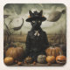 This whimsical Halloween artwork features a stylish black cat dressed as a Victorian witch, surrounded by a quirky array of jack-o'-lanterns under a surreal autumn sky. A perfect blend of spooky and charming, this fantasy print is ideal for Halloween lovers, gothic decor fans, and anyone who enjoys magical realism with a feline twist.